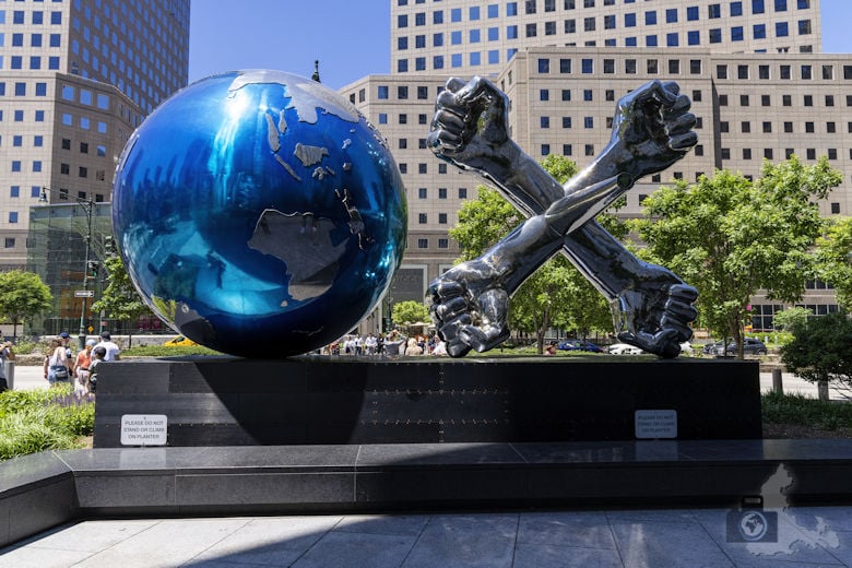Wir haben nun klar das One World Trade Center im Auge, wo uns einige Highlights erwarten. Zunächst kommen wir am Ground Zero Memorial vorbei, wo vor dem Anschlag des 11. Septembers die berühmten Zwillingstürme standen. Ich weiß bis heute genau, wie ich schockiert die Geschehnisse an jenem tragischen Tag verfolgt habe. Heute finden sich hier richtig schöne gestaltete Wasserfall-Becken mit den Grundrissen der Türme, umrahmt von Metallplatten mit den Namen der Opfer. Das Wasser, das die Becken hinab fließt glitzert fast ein wenig magisch in der Sonne.