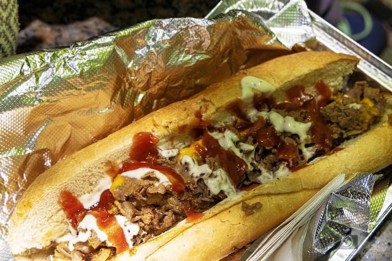 Nun melden sich langsam unsere Mägen vor Hunger und unsere Füße zwecks Auszeit. Wir laufen ein wenig zurück, von wo wir gekommen sind, hinein in eine Art kleinen Park mit vielen Sitzgelegenheiten, in dem mehrere Food Trucks stehen. Hier kaufen wir uns ein paar Philly Cheese Steaks und genießen so dann sowohl den Klassiker, als auch die kleine Auszeit.