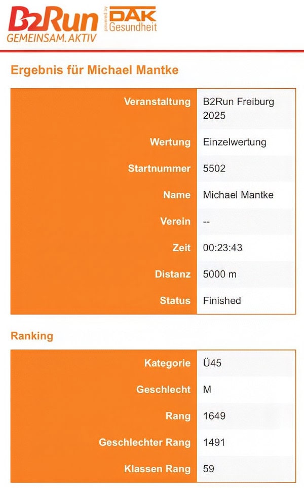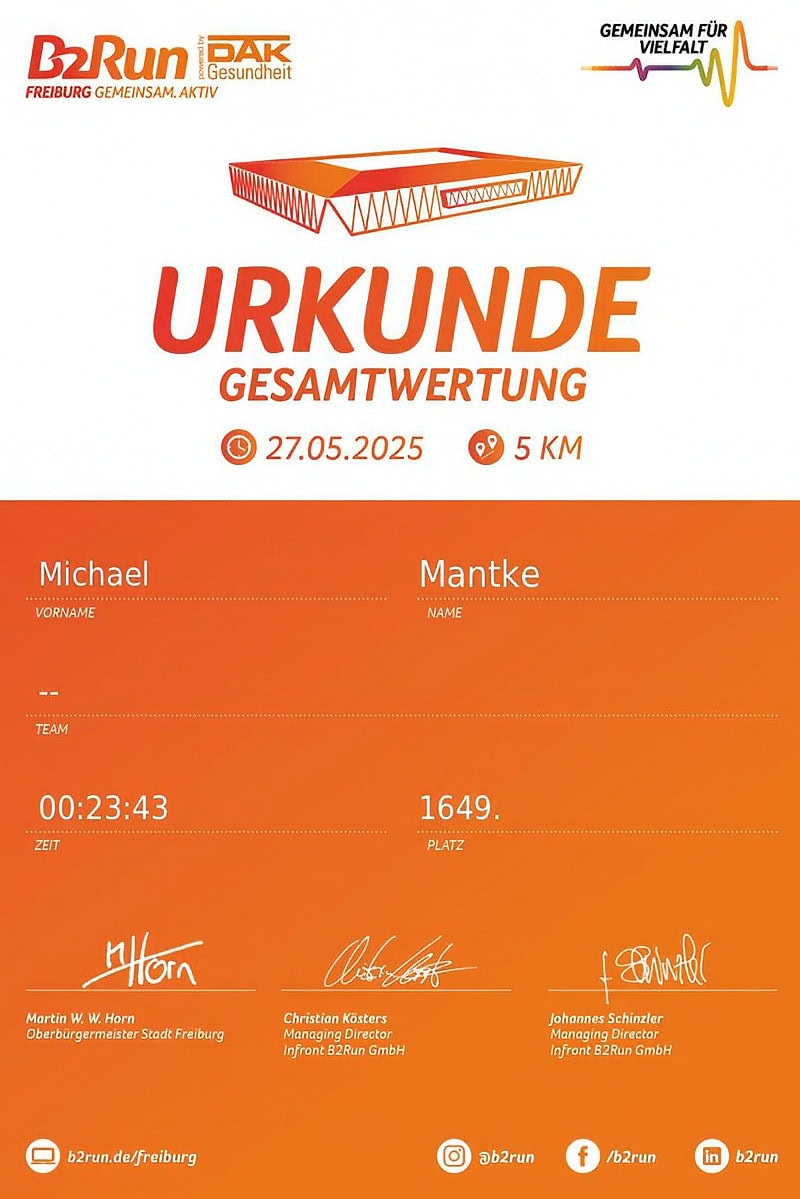 Der B2Run 2025 in Freiburg hat sich auch in diesem Jahr definitiv gelohnt. Über 12.000 Läufer waren am Start. Ich belege am Ende stolz Platz 1.649 mit neuer persönlicher Bestzeit über die Strecke von 5 Kilometern.