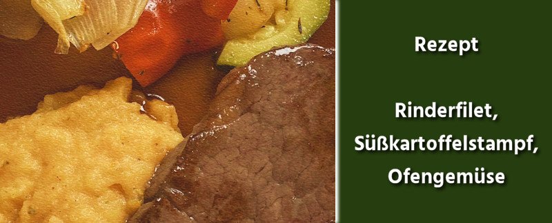Ich muss gestehen – ich liebe ein gutes Rinderfilet! Das darf dann auch gern mal etwas mehr kosten. Besonders zart wird es, wenn du es Sous Vide garst. Kombiniert mit einem Süßkartoffelstampf und leckerem Ofengemüse, sowie einer intensiv schmeckenden Rotweinreduktion ergibt das ein Gericht, mit dem du jeden Gast schwer beeindrucken wirst.